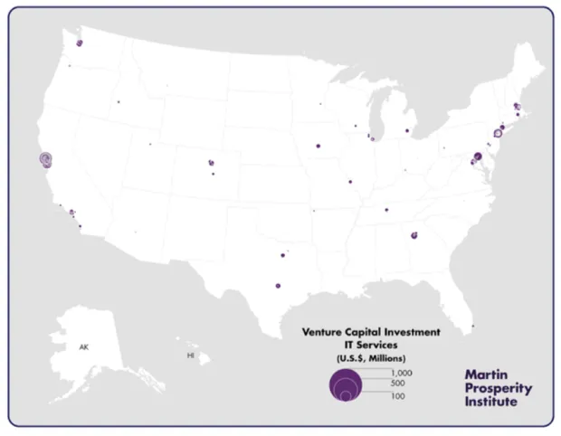 第五张地图展示了信息技术服务领域的风险投资地理分布,该领域仅吸引了20亿美元,占美国所有风险投资的6%。如下面的地图所示,这部分投资主要集中在旧金山湾区、波士顿、纽约市、华盛顿特区、西雅图和亚特兰大。