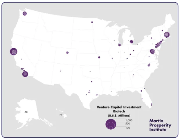 第二张地图显示了生物技术的模式,该领域吸引了57亿美元,或全国所有风险投资的17%。投资再次集中在湾区、南加州以及纽约-波士顿-华盛顿走廊,以及西雅图和底特律等较小的城市。