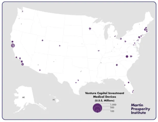下面的第四张地图显示了医疗设备和器械的模式,这占国家风险投资的稍小份额:24亿美元,约占7%。大部分投资位于旧金山湾区、波士顿、南加州、纽约、明尼阿波利斯-圣保罗和北卡罗来纳州,尽管投资的聚集程度远低于其他高科技行业,如下图所示。