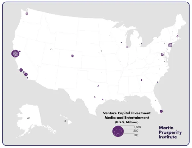 下面的第三张地图显示了媒体与娱乐行业的风险投资投资地理,这个行业吸引了另外32亿美元,或全国风险投资投资的近10%。这次,风险投资主要集中在湾区、大洛杉矶地区和纽约,西雅图、丹佛、华盛顿特区和迈阿密附近也有较小的聚集。