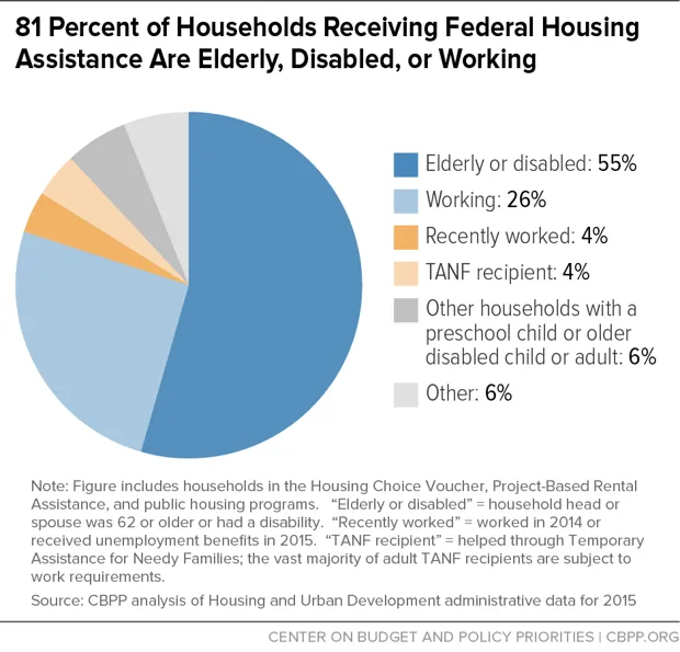 预算与政策优先中心 报告称,2015年,超过一半居住在补贴住房中的家庭——公共住房、凭借代金券获得的住房或其他联邦援助——要么是老年人,要么是残疾人。另有六个百分点的家庭中有学龄前儿童或残疾儿童。超过四分之一的补贴家庭实际上有家庭成员在工作。