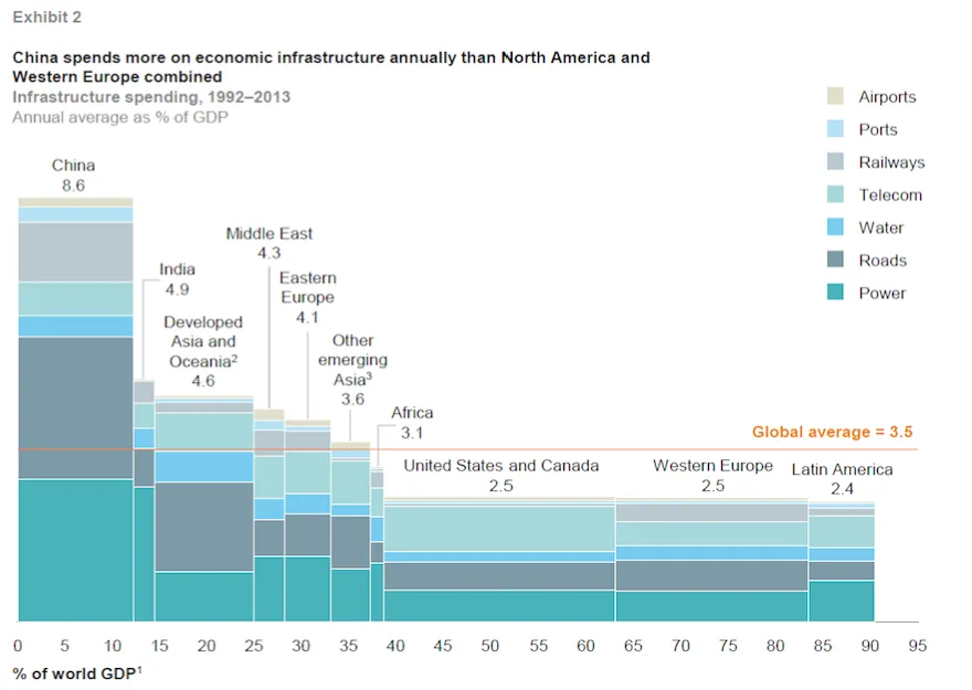 下面的图表来自MGI报告,显示了中国在基础设施支出方面的实力。它的柱子是最高的。彩色切片代表不同类型的基础设施,而柱子的宽度则表示经济的规模。美国的柱子宽而短,因为它代表了一个大经济体但支出较低。