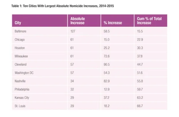 他的NIJ报告试图提供一些方向,帮助人们看待2015年美国各城市凶杀案上升的情况,尽管数据有限。首先,应该注意到,自2014年以来凶杀案的上升是真实存在的。在罗森费尔德的研究中,他查看了56个主要城市(人口超过25万)的凶杀率,发现2014-2015年的凶杀案激增是“几乎前所未有的”。
