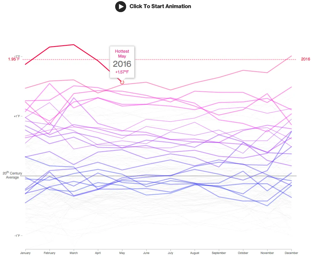 随着厄尔尼诺的影响减弱,新月度记录变得不那么戏剧化,如上方动画中的下降所示。这并不意味着我们会回到正常温度,北卡罗来纳州阿什维尔的美国国家环境信息中心主任德克·阿恩特说。气候变化就像在上升温度的自动扶梯上,他说,而厄尔尼诺就像是在上面跳跃。