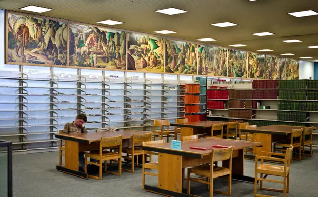 加州长滩的新政时代画作。由罗伯特·道森提供美国的公共图书馆 正处于十字路口。一方面,它们仍然是受人喜爱的公共资源。76%的美国人表示,他们的图书馆很好地满足了社区的教育需求,2016年4月的皮尤调查发现。但在过去12个月中,只有44%的人实际上走进了当地的图书馆或流动图书馆,比三年前下降了9%。此外,图书馆越来越多地被要求 为更多的人提供更多的服务——数字教室、公共卫生中心、创客空间——而可用的资金却越来越少。由于所有这些原因,它们面临着不确定的未来。