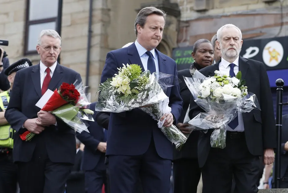 英国首相大卫·卡梅伦和工党领袖杰里米·科尔宾在被谋杀的国会议员乔·考克斯的纪念活动上。菲尔·诺布尔/路透社在英国,周四乔·考克斯被谋杀的消息让人感到震惊,难以言表。乔·考克斯是一位工党国会议员,长期以来积极支持难民和人权运动,在她位于英格兰北部的选区与公众见面时被刺杀和枪击,随后在医院去世。在一个严格控制枪支的国家(谋杀武器似乎是自制的),一位备受喜爱的政治家以这种方式去世似乎是幻想,不真实。