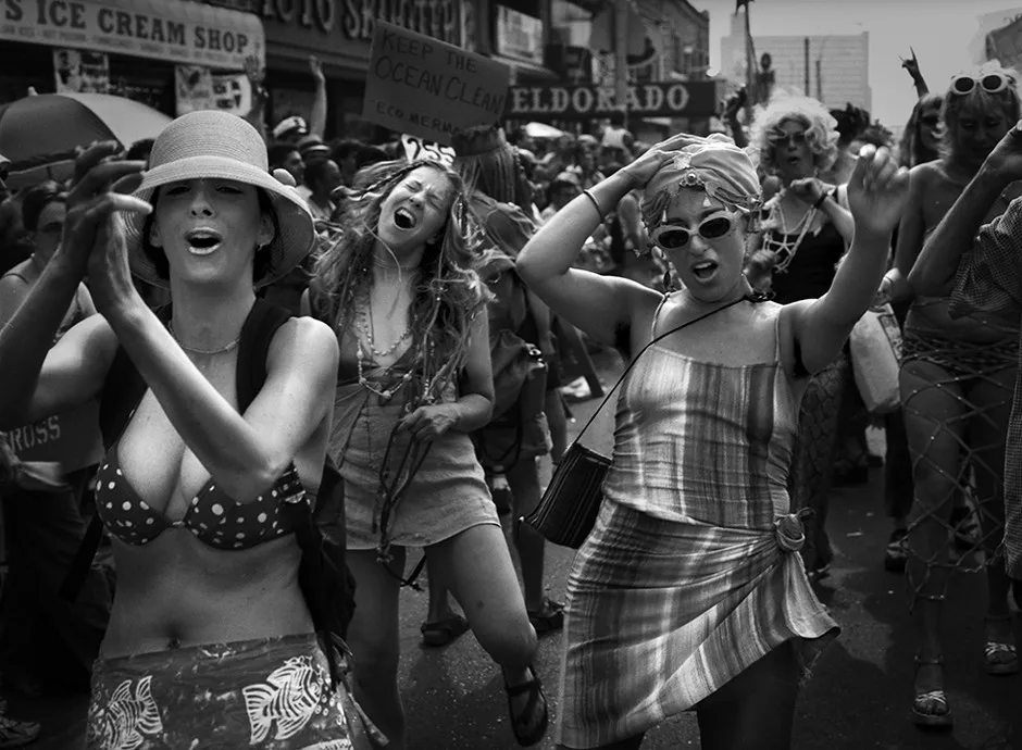 他当时并不知道自己会每年回来。但他确实回来了,拍摄了数百张照片,其中一部分将在6月24日的 画廊展览上首次公开,展览在今年游行一周后于布鲁克林开幕。在美人鱼游行期间,拉特雷的作品逐渐成熟,他的视野也变得更加清晰。他相信自己的眼光能够在拥挤的人群中找到真正的美——这个活动现在吸引了大约15,000名游行者和约700,000名观众。