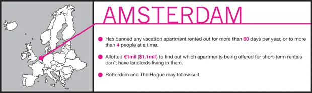 荷兰最大的旅游目的地现在禁止任何度假公寓每年出租超过60天,或同时出租给超过四个人。自四月以来,该市一直在“抓取”数字记录,以查看是否能找出哪些短期出租的公寓不再有房东居住。潜在的物业数量庞大,但该市已拨出€100万($112.5万)来资助搜索。其他荷兰城市,包括鹿特丹和海牙,现在也在考虑效仿。