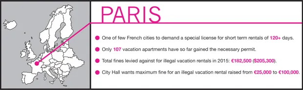 一个国家法律于2012年出台,允许任何人口超过200,000的法国城市要求任何短期出租超过120天的公寓必须获得特别许可证。巴黎是少数实施该法律的城市之一,但到目前为止,合规性相当薄弱,执行力度不足。在整个巴黎,迄今为止只有107个度假公寓获得了必要的许可证。一些非法房东已被罚款,但大多数仍然逃脱了惩罚,2015年征收的总罚款仅达到€182,500($205,300)。然而,未来情况可能会变得更加严厉。目前,巴黎市政府正试图将非法度假租赁的最高罚款从€25,000提高到€100,000,这可能会威慑更多当前的违法者。