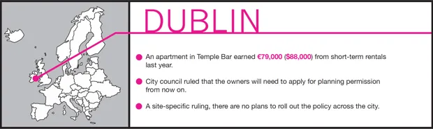爱尔兰的首都推出了迄今为止欧洲最轻的反度假租赁规则。中央都柏林旅游热点坦普尔酒吧的居民今年震惊地得知,该地区的一套公寓去年通过Airbnb的短期租赁赚取了惊人的 €79,000($88,000)。在抗议之后,市议会裁定,如果业主希望继续短期出租公寓,则需要申请商业使用的规划许可。然而,该裁定是“特定地点”的,因此目前没有计划在全市推广该政策。