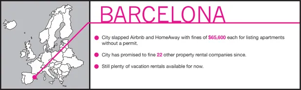 加泰罗尼亚的首府对度假出租的官方态度是欧洲最严格的之一。房东需要从市政府获得许可证才能合法出租他们的物业,而去年十二月,他们对Airbnb和HomeAway处以65,600美元的罚款,因为这些公寓没有这个许可证。考虑到这些公司的利润,这些金额是象征性的,但对他们来说仍然是令人不安和尴尬的。巴塞罗那此后承诺将对22家额外的物业出租公司处以罚款。目前仍有很多度假出租可供选择,但游客最好更加小心,以做一个好客人。巴塞罗那的限制是在对吵闹的反社会游客和剥削性房东的强烈抗议后出台的,因此许多人对这种情况的耐心显然已经有些消耗。