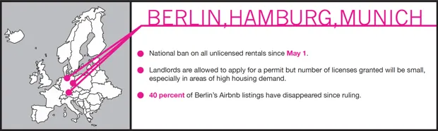 目前在欧洲,德国的三个大城市对度假租赁服务的监管最为严格,所有无牌租赁的禁令于5月1日生效。虽然房东官方上可以申请许可证,但发放的许可证数量将故意保持在较少的水平,特别是在住房需求高的地区。柏林的房东曾试图在法庭上挑战这一法律(在较小的城市弗莱堡也在实施),但他们的诉求本月早些时候被驳回。这一举措被认为是增加可供永久居民使用的住房供应的必要措施,已经产生了显著的影响,柏林的Airbnb房源在法律实施前消失了40%。尽管一些房东已经被起诉(如在这个案例中),但打击行动可能仍需数年时间。所有受影响的城市仍有大量短期出租的公寓,尽管其中一些可能在接下来的几个月内消失。