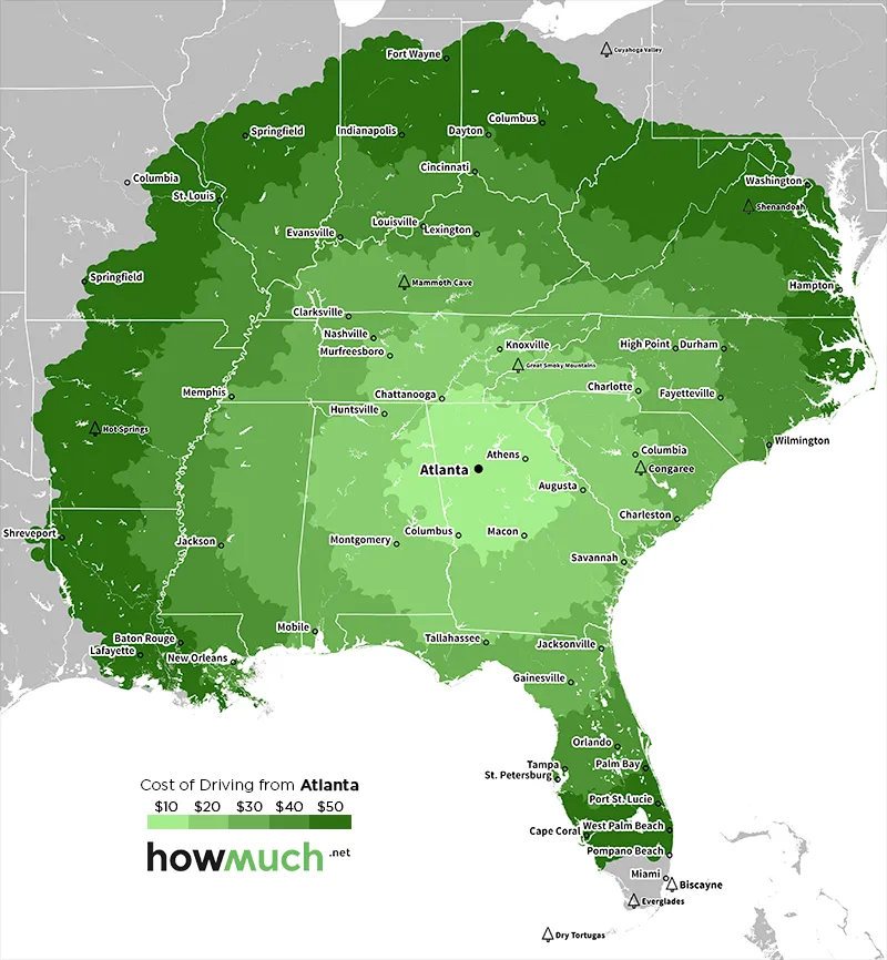 有时候,比如在亚特兰大的情况下,通过选择短途旅行,你可能会节省金钱和失望。HowMuch.net指出,从亚特兰大出发,油箱里有50美元: