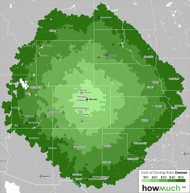 HowMuch.net指出,位于美国中部的城市享受着不间断半径的好处。从丹佛出发的50美元车程可以让你到达锡安国家公园或德克萨斯州的埃尔帕索;从芝加哥出发,你可以到达尼亚加拉大瀑布或孟菲斯。
