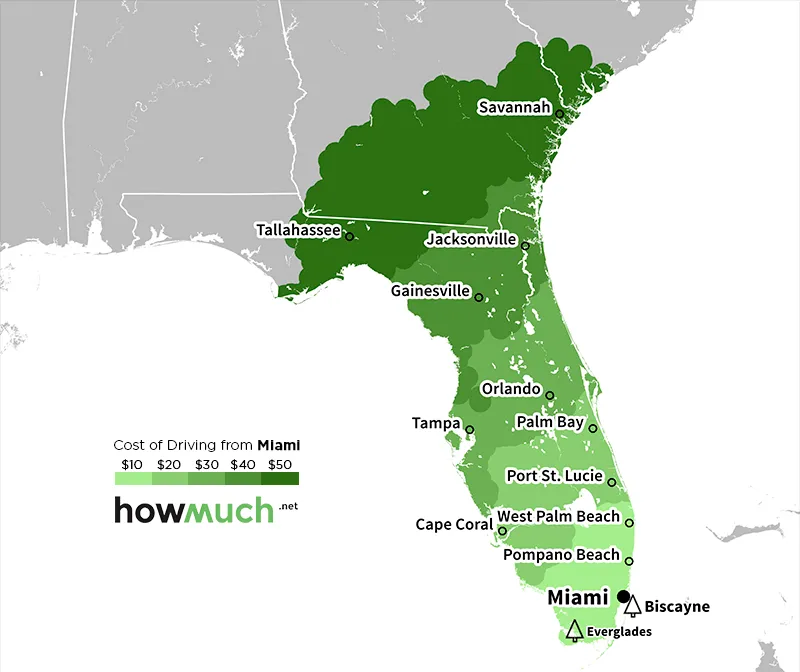 今年,随着燃料成本的下降,油箱里的50美元可以让你走得很远。根据油价的平均水平和假设一辆车每加仑行驶24英里,成本信息网站HowMuch.net绘制了从城市中心出发,在高速公路上缓慢行驶之前,你可以开多远。