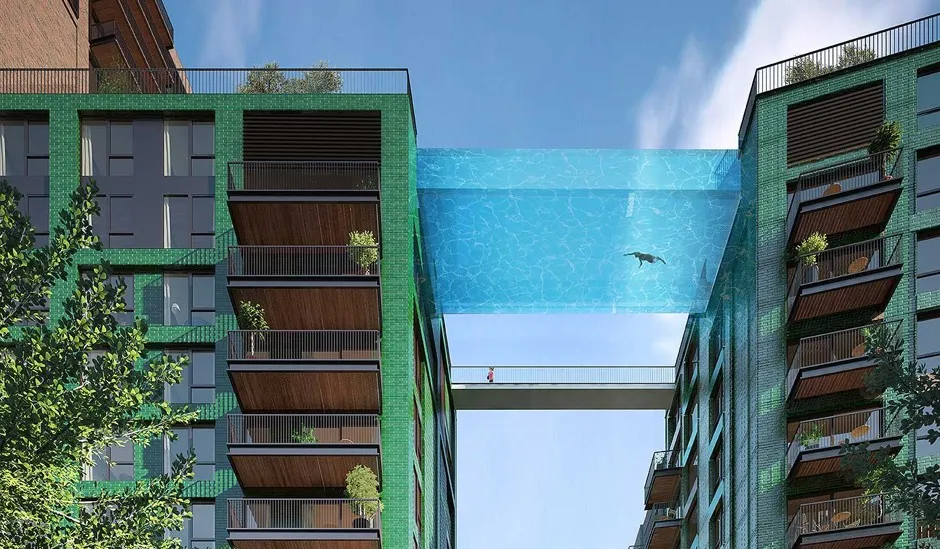 在八月份,位于伦敦九榆树区的巴特西发电站附近的新住宅开发项目大使花园的支持者宣布了一个高于地面的游泳池计划。所谓的 天空泳池 将悬挂在离地面10层的高度,连接伦敦最豪华的新区域中的两座住宅塔楼。