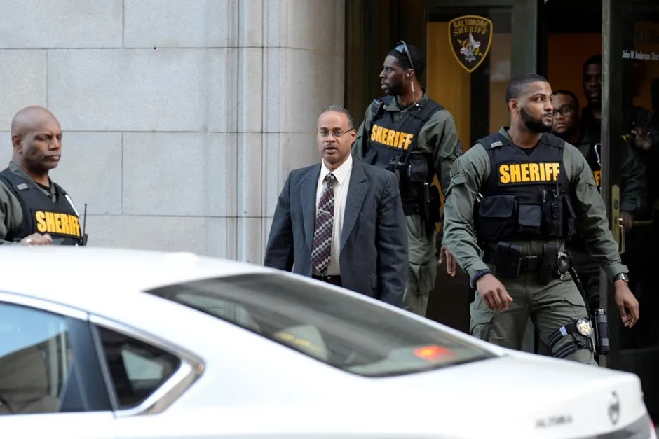 警官凯撒·古德森于6月14日离开巴尔的摩的法院。布莱恩·伍尔斯顿 / 路透社巴尔的摩警官凯撒·古德森在2015年4月驾驶的面包车中,弗雷迪·格雷遭受致命伤害,周四早上法官裁定他对所有七项指控无罪。