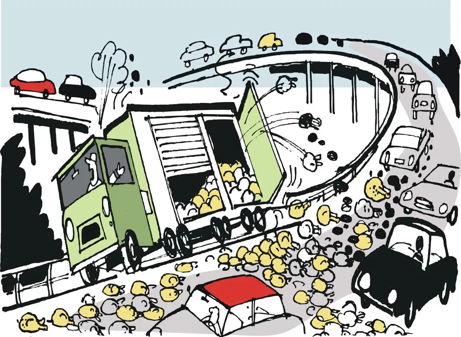 故事并没有就此结束。运送家禽的卡车在撞击时起火,导致烤鸡散落在路上,而蜜蜂在空中嗡嗡作响。