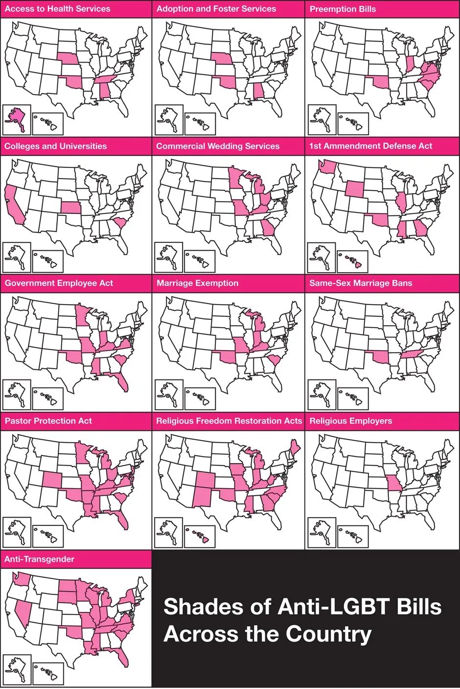 根据HRC的信息和来自 美国公民自由联盟的数据,并借助州资源,CityLab编制了一系列地图,以展示当今出现的反LGBT立法类型及这些法案出现的地点。HRC并未分享其详细的立法追踪结果,因此这些地图代表了2016年立法努力的快照。所有讨论中的法案至少在 这些州出现过,但可能有些缺失(而且更多可能很快出现在州议会中)。由于下面解释的原因,追踪反LGBT立法有时涉及解析一些滑动的逻辑。
