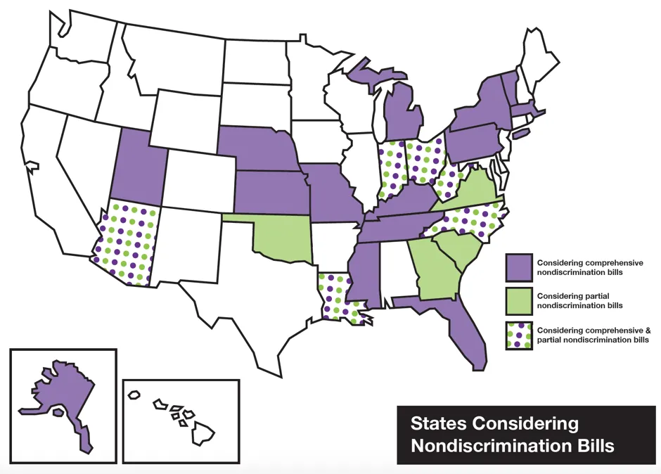目前有17个州的法律中有全面非歧视法。上面的地图显示了2016年提出非歧视法律的州。这很快就会变得混乱:例如,犹他州已经禁止基于性取向和性别认同的歧视;然而,2月份提出的一项法律S.B. 241将扩展法律,特别保证在公共场所和商业机构中的这些保护。