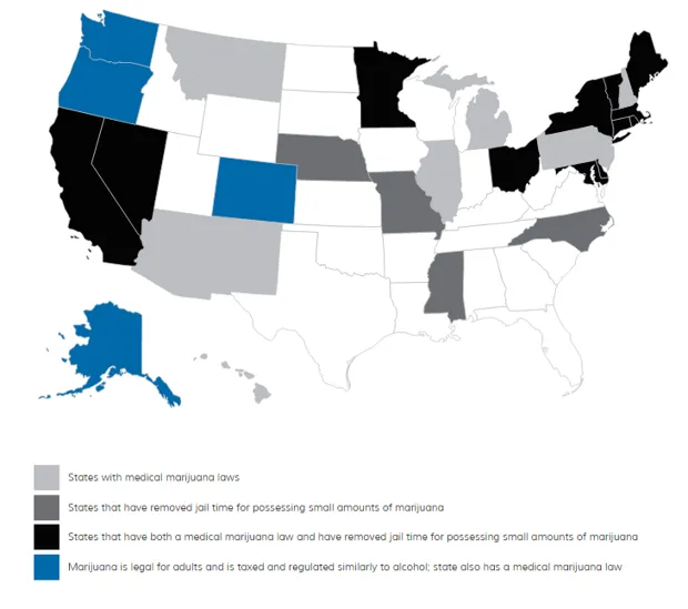 鉴于大麻在全国的法律地位不均,这个问题在各州之间差异很大。只有四个州合法化了大麻;还有一些州允许医疗使用,或已将持有大麻非刑事化,或两者兼而有之。(请参见下面的地图来自大麻政策项目。)大多数州遵循联邦法律,根据该法律,大麻是非法的。