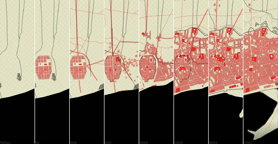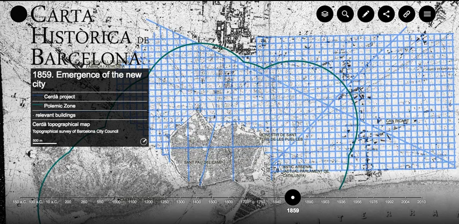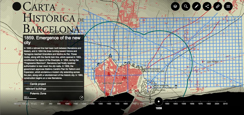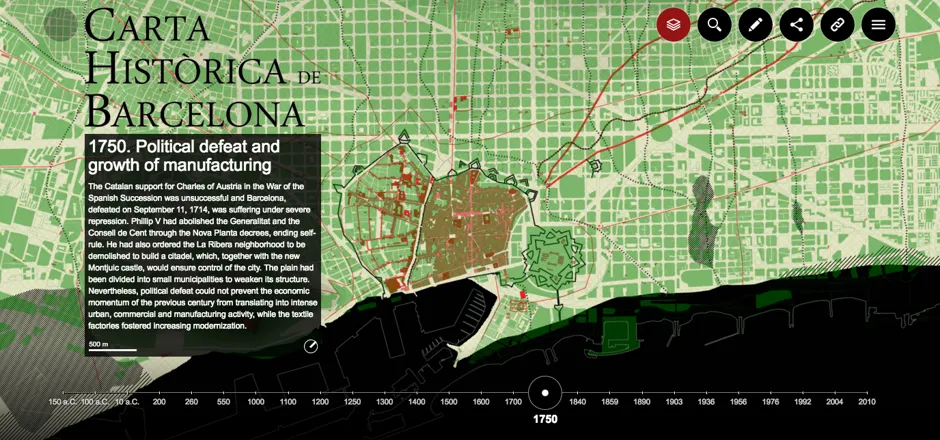 该项目展示了24张地图,每张地图代表城市发展过程中的一个不同里程碑。这些地图来自历史和考古来源,经过标准化、交叉检查和历史学家的校正,最终叠加在时间线上。每张地图都附有一段简要说明,概述当时城市规划的发展。用户可以从一张地图翻到另一张,清晰地跟随巴塞罗那从一个小城市定居点演变为今天繁忙大都市的过程。再次引用新闻稿: