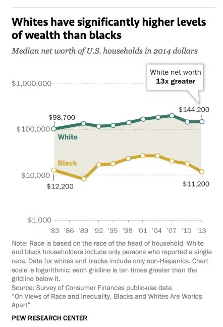 皮尤:种族财富差距比收入差距更严重,白人家庭的财务净资产超过13倍于黑人家庭。而且这种财富差距并不是新问题,尽管奥巴马持有乐观的经济观点:实际上,这一差距多年来一直在扩大,2014年黑人家庭的平均净资产甚至低于1983年非裔美国人的水平。