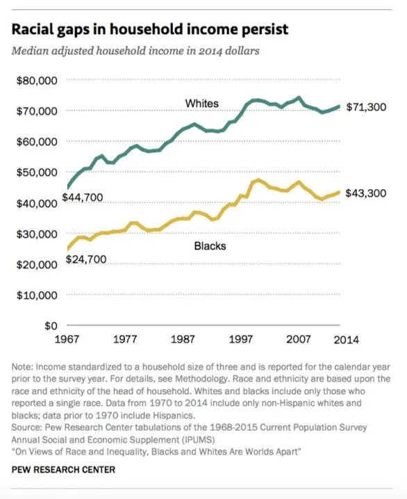 皮尤:确实,自1970年代中期以来,非裔美国人的贫困率有所改善。然而,今天非裔美国人的贫困率是白人美国人的两倍多。同时,收入的种族差距在扩大:2014年,白人家庭的中位收入为71,300美元,而黑人家庭为43,300美元。2014年黑人家庭的中位收入低于1967年白人家庭的中位收入,当时为44,700美元。这意味着黑人家庭现在所赚的钱与马丁·路德·金被杀前一年白人家庭所赚的钱相当。