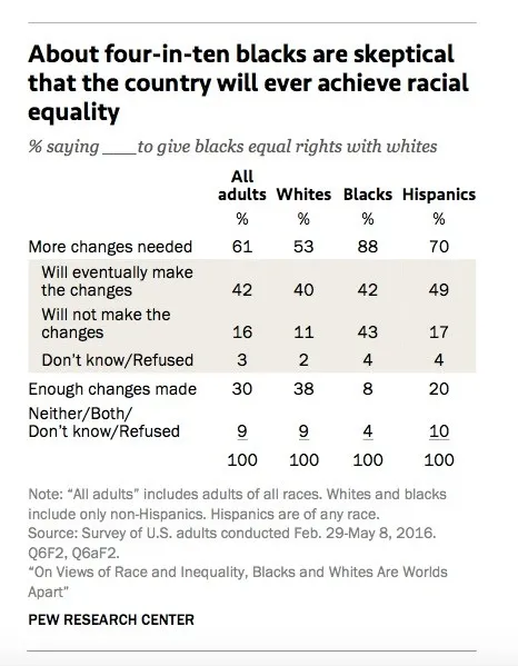皮尤:不,这不是事实。超过三分之一的非裔美国人(37%)告诉皮尤,当前的种族关系很糟糕——在这些人中,51%认为情况只会变得更糟。相比之下,只有15%的非裔美国人告诉皮尤,当前的种族关系很好。43%的非裔美国人坚信美国不会采取必要措施实现种族平等。