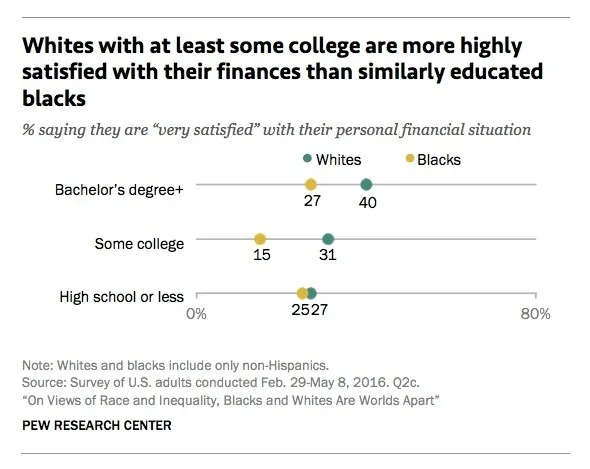 这可能解释了为什么在Pew调查中,接受过大学教育的白人表示他们对自己的经济状况远比接受过大学教育的非裔美国人更满意。同时**,**Pew发现,接受过大学教育的非裔美国人对自己的经济状况的满意度低于那些从未上过大学的黑人。