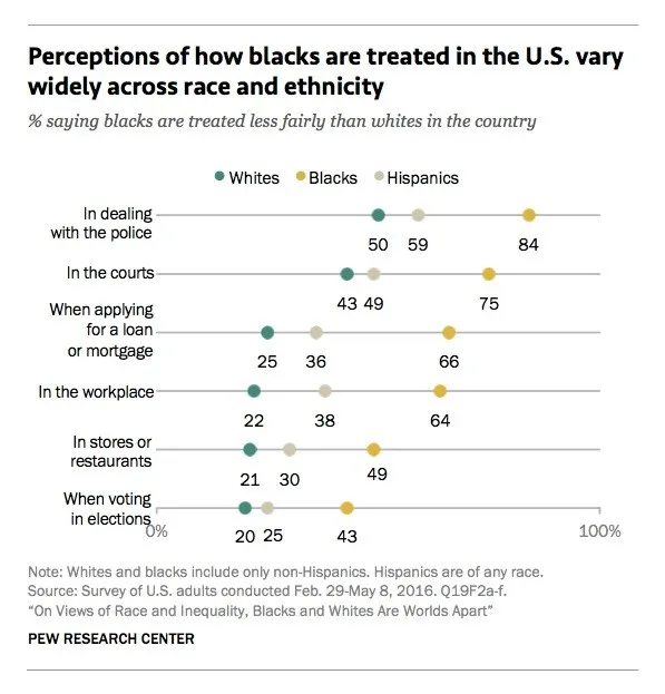 这份 报告的名称一语道破:“在种族和不平等的看法上,黑人和白人之间的差距巨大。”虽然这与过去的皮尤种族调查并不矛盾,但确实反映了本世纪对种族关系的一些最悲观的看法。
