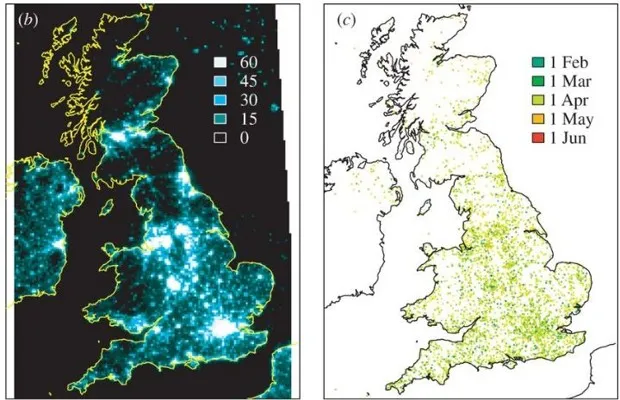 (研究人员将英国的光污染(左)与树木如悬铃木的发芽时间(右)进行了比较。)皇家学会B辑的会议记录科学家们已经知道一段时间,人工光源(尤其是红色光谱中的光)虽然通常不足以触发光合作用,但可以改变树木对“白天”的感知,从而导致不同的发芽/开花时间,并延长其整体生长。埃克塞特的研究证明这种现象在广泛范围内发生,并量化了来自英国大量街灯和商业设施的异常生长效应。
