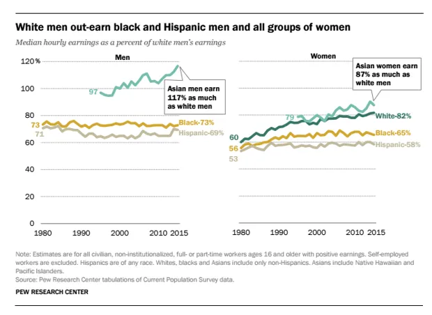 彭博社城市实验室纽约市通勤者在最新的交通混乱中被困在公交车和火车上在创纪录的炎热夏季之后,空调强制要求的压力增加研究发现,城市地区的降雨量超过农村边缘地区芝加哥暂停招聘,因为赤字在2025年前超过10亿美元一项来自 新的研究 由皮尤研究中心进行,为最后一点提供了可信度。研究人员比较了不同种族群体中男性和女性工人的小时中位数工资与白人男性的工资——这是美国劳动力中最大的群体**。**(他们也是最 历史上和经济上特权的群体。)在他们的报告中,研究人员分享了他们的发现:2015年,黑人男性的收入仅为白人男性的73%,而西班牙裔男性的小时收入仅为69%。只有亚洲工人的情况更好:每小时24美元,他们的收入比白人同事多3美元(约为白人男性小时收入的117%)。