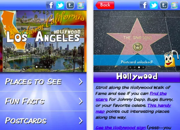 这个应用程序有五个美国城市的版本,包括洛杉矶、奥兰多和华盛顿特区,更多版本正在开发中。里面有很多古怪的趣味问答、挑战、地图、电子明信片,以及一个“难倒父母”的部分,给孩子们提供了可以问父母的测验问题。