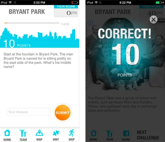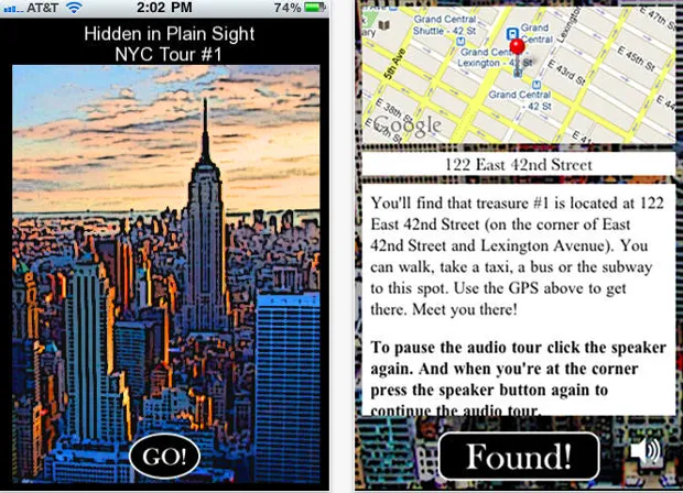 这个寻宝活动专注于发现纽约市中央车站和洛克菲勒中心周围的公共艺术。应用程序显示一幅图像的片段,用户必须根据线索找到真实的完整作品。当他们找到时,会获得更多有趣的事实。