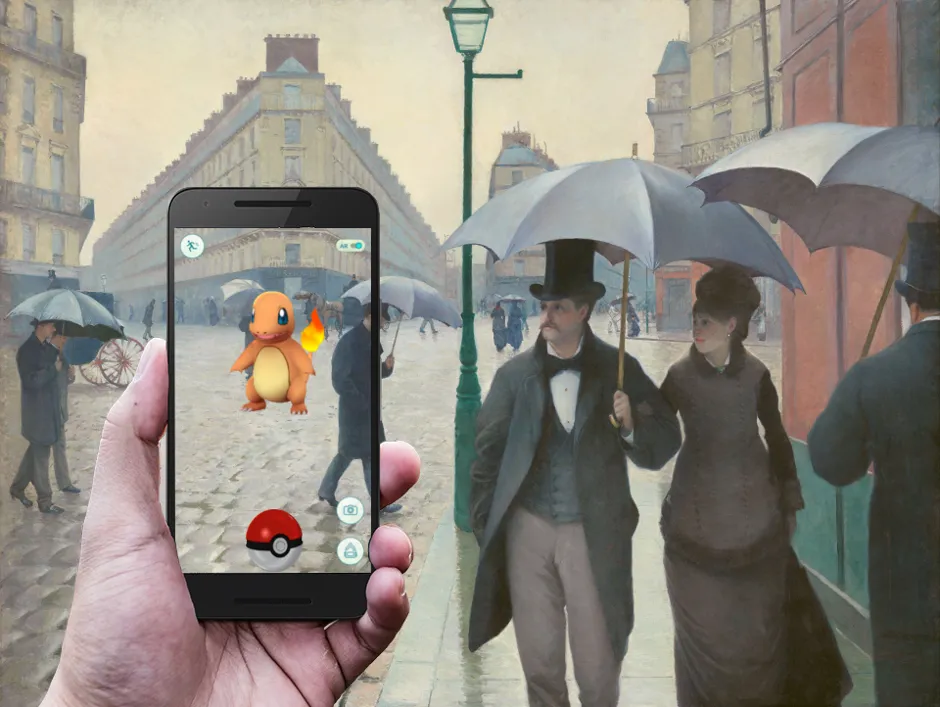 宝可梦Go/古斯塔夫·卡耶博特,“巴黎街道,雨天,”1877在增强现实智能手机应用 宝可梦Go中,玩家从家中出发,寻找虚拟宝可梦和与现实世界位置相关的各种游戏场所。自7月6日发布以来,估计有 750万次美国下载 ,这款游戏已成为真正的热潮。