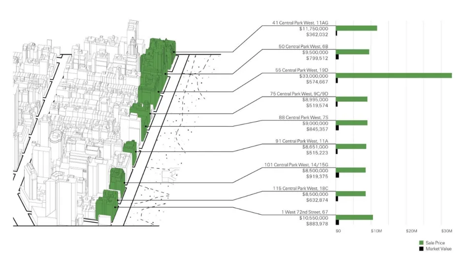 我们区域内记录的最昂贵的销售之一是3300万美元,位于中央公园西的一栋111单元建筑中的一个单一合作公寓。市政府对整栋建筑的市场价值评估——所有111个单元——为6072200美元,仅比一套奢华建筑中单个公寓的销售价格高出28000000美元。那套3300万美元的公寓的销售价格几乎是财政部为税务目的评估的价值的60倍。