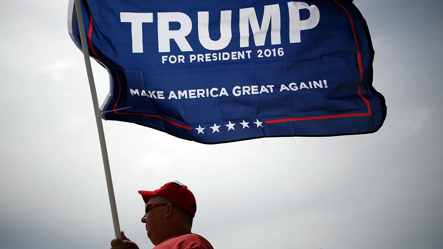 一位与会者在2016年7月6日于俄亥俄州辛辛那提的唐纳德·特朗普活动外挥舞着竞选旗帜。