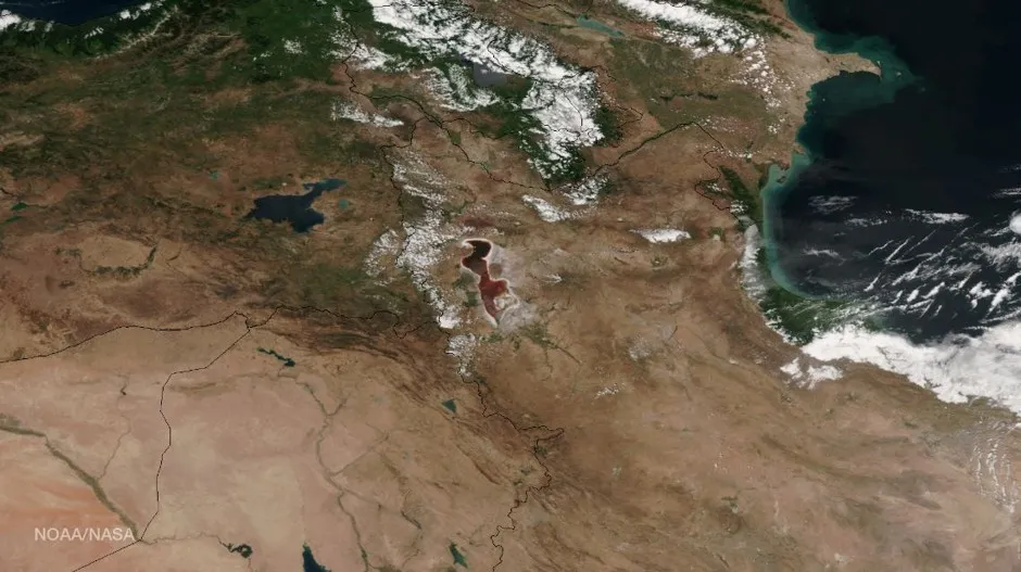 国家海洋和大气管理局/国家航空航天局在正常情况下,乌尔米湖位于伊朗西北部,呈现出海蓝色或绿色,如2014年国际空间站拍摄的这张照片所示: