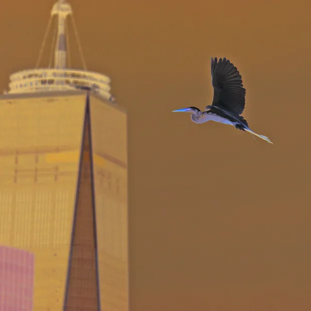 一只大白鹭在世界贸易中心前滑翔。希瑟·沃尔夫但是,将歌曲与鸟类配对可能很棘手,沃尔夫补充道,尤其是在夏季高峰期,当茂密的树木上满是分枝的叶子时,可能会遮挡任何翅膀的视线。沃尔夫建议,不要通过双筒望远镜观察——这会限制你的视野——而是用裸眼扫描任何明显的移动痕迹。沃尔夫说:“寻找树枝的移动,‘比风更有力,但又没有松鼠那么有力。’”然后,一旦你锁定了一个特定的地方,慢慢将双筒望远镜带到眼前以放大视野。