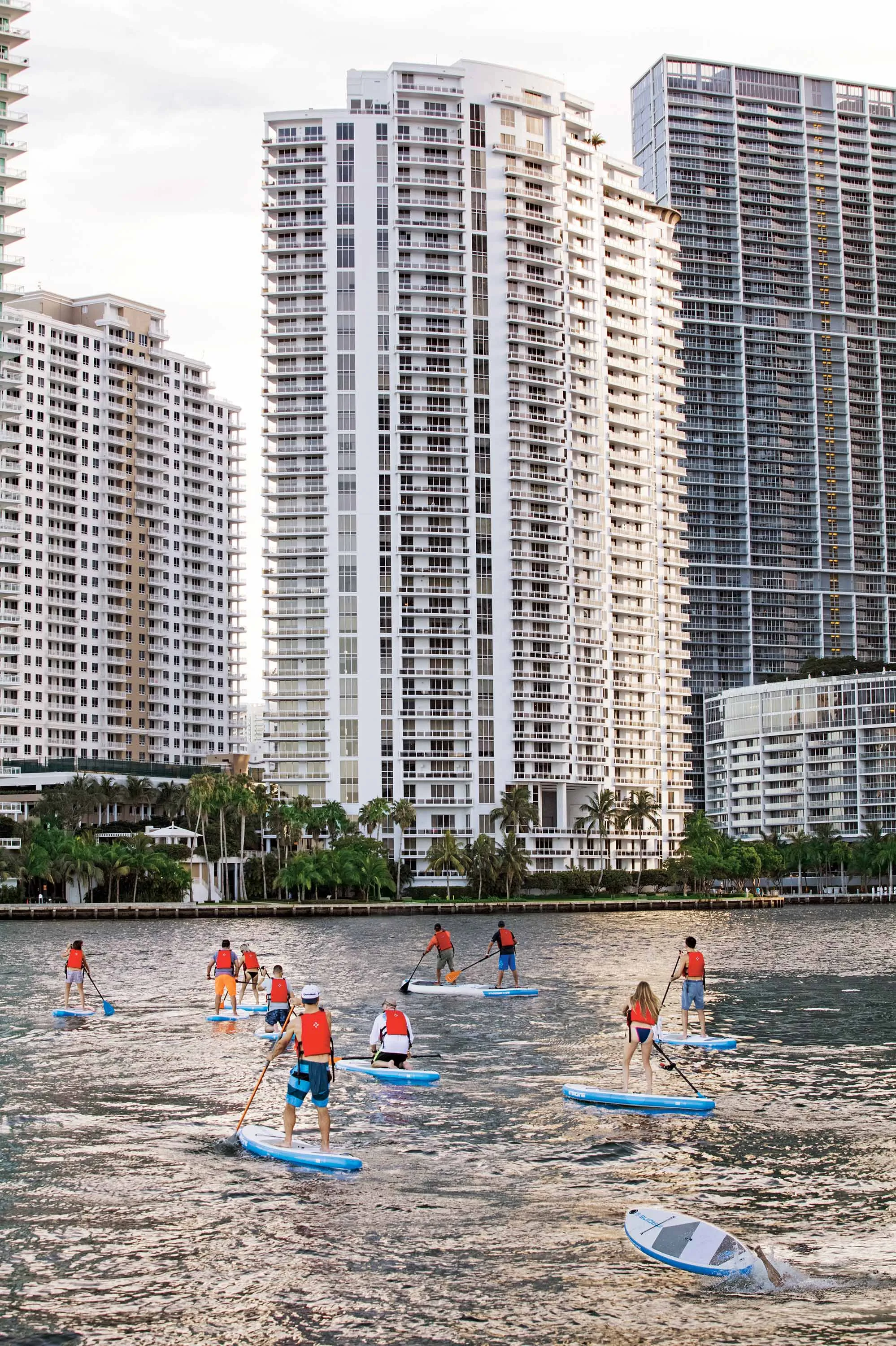 六十名立式划水者在六月的一个温和夜晚漂浮在比斯坎湾。西边,太阳在迈阿密天际线下沉。一个摄影师在水中摇晃着拍照,他们摇摇欲坠地经过。一架无人机在头顶嗡嗡作响,拍摄视频。划水者在迈阿密河处右转,朝着他们的目的地驶去:一艘120英尺的三层派对船,装满了满是米克罗布超啤酒的冷却箱。