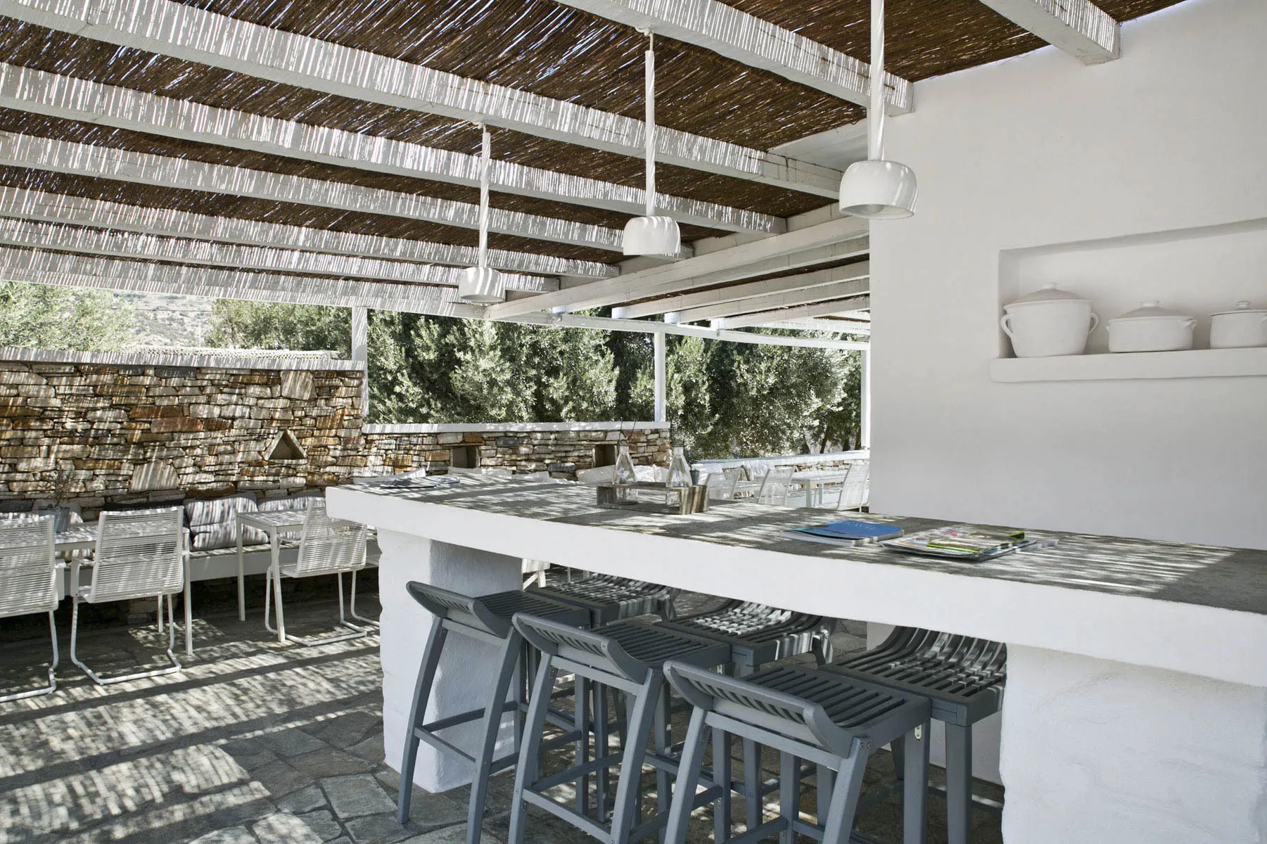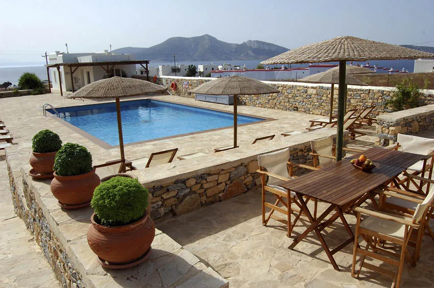 Aeolos酒店的泳池区。来源:Aeolos酒店***住宿推荐:***镇上最豪华的酒店是 Aeolos,位于主要聚落的山顶。房间宽敞,虽然简单,但环境无与伦比;开满九重葛的露台和户外游泳池提供了绝佳的海湾景观。