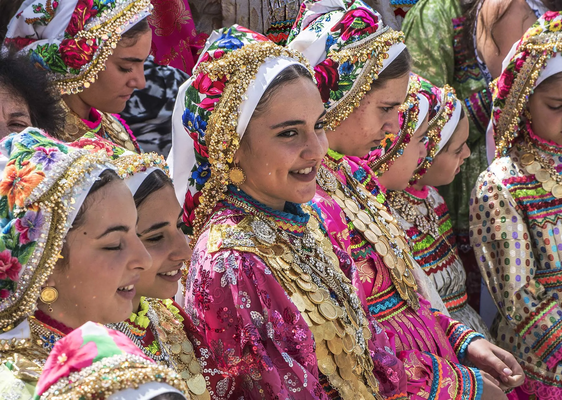 在奥林波斯的圣母升天日,女孩们佩戴着金币项链。