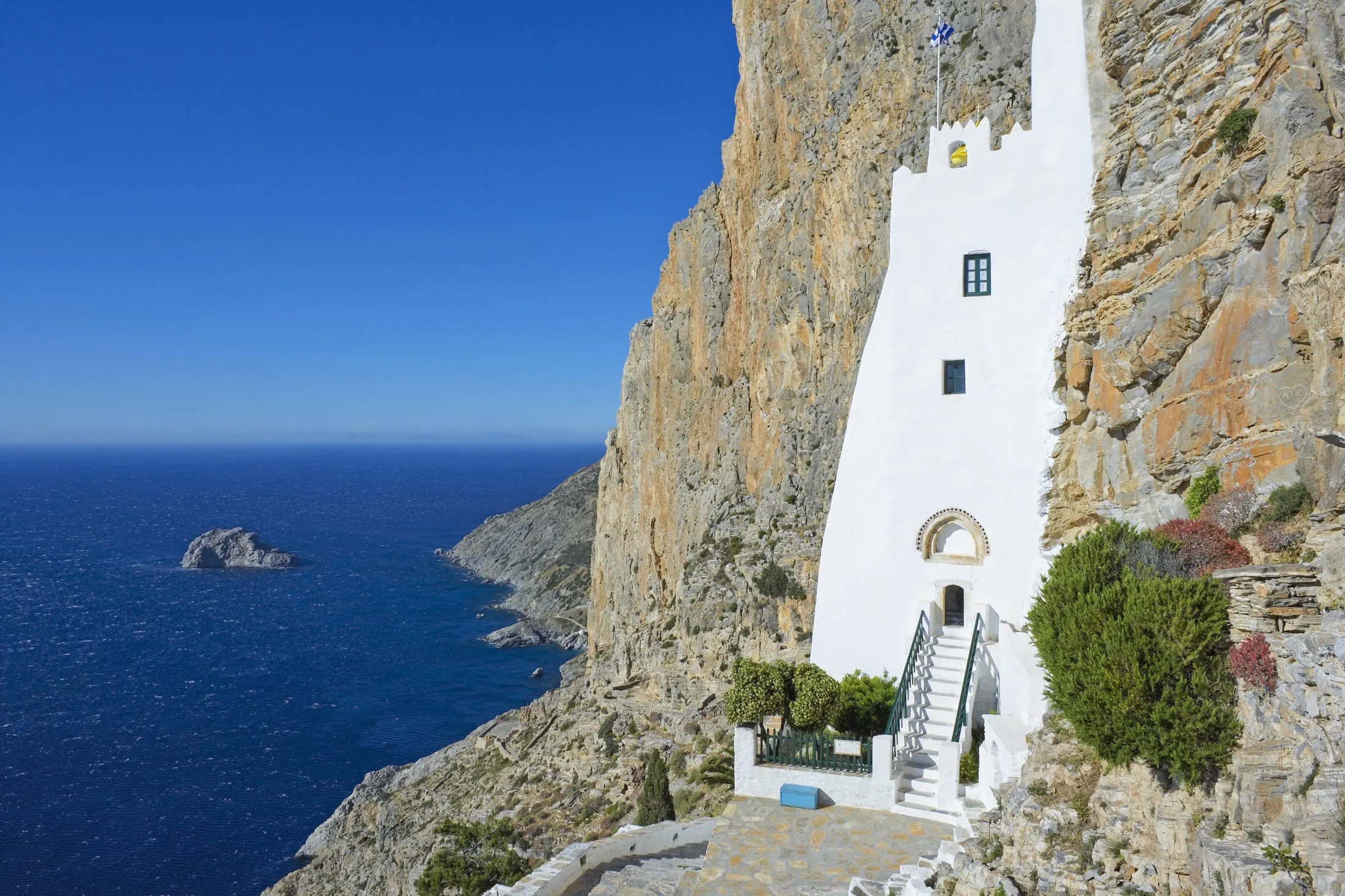 阿莫尔戈斯的乔佐维奥蒂萨修道院。摄影师:马尔科·西莫尼/Getty Images/AWL Images RM大多数来到 阿莫尔戈斯,这个基克拉泽斯群岛最东端的岛屿,都是为了朝圣于吕克·贝松的自由潜水史诗 大蓝*。*如果你想追随他们的脚步,深入爱琴海,希腊海军特种部队退役军人迪米特里斯·西诺迪诺斯经营着已有十年的 阿莫尔戈斯潜水中心,提供潜水和浮潜旅行,以及首次潜水者的自由潜水认证。