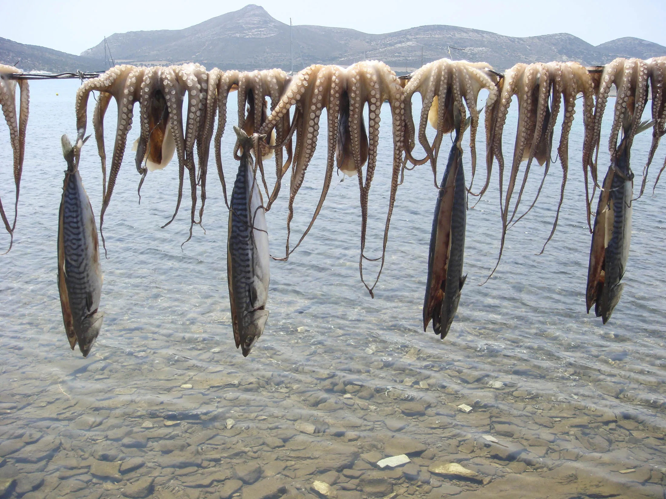 章鱼和鱼在安提帕罗斯等待烹饪。