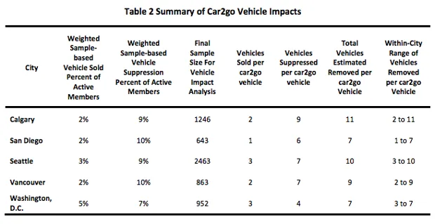对于绝大多数受访者来说,car2go 对他们的车辆拥有没有任何因果影响。只有 2% 到 5% 的活跃会员表示他们因 car2go 的运营而出售了一辆车。7% 到 10% 的人表示他们避免购买汽车。但这些相对较小的百分比转化为可观的影响。研究人员发现,每辆 car2go 车辆在街上,会员出售了大约一到三辆个人车辆,并避免购买了四到九辆车辆。总体而言,每辆共享的 car2go 车辆使多达 11 辆个人汽车从道路上消失。(有关此的城市特定细节可以在下面的表格中找到。)在五个研究城市中,这总共减少了 28,000 辆汽车。