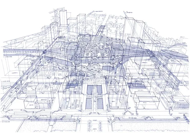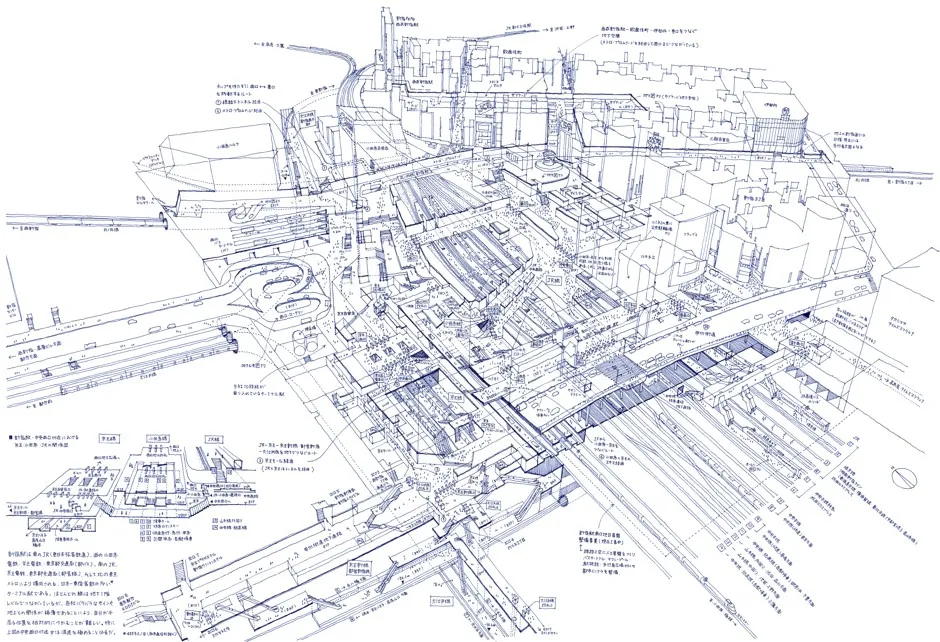 田中于2005年首次受委托绘制新宿站,委托方是日本建筑杂志 商店建筑。 “新宿站的拆除”,以及田中其他几幅研究作品,作为 土木:土木工程的一部分,正在东京的21_21设计视点画廊展出,展览将持续到九月底,致力于展示城市复杂的基础设施。
