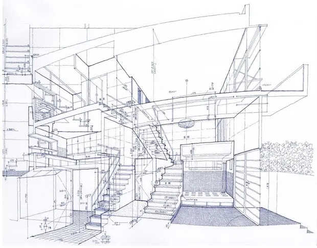 亀木土浦住宅。田中智之尽管他的X光式研究表达了高度的具体性,田中仍能迅速完成这些研究,通常不超过几周。他会花大约一周的时间研究和整理关于建筑的信息。一旦有了计划,田中会用铅笔草拟基本的布局和建筑设计。对于更细致的细节和人物,他会转用圆珠笔。