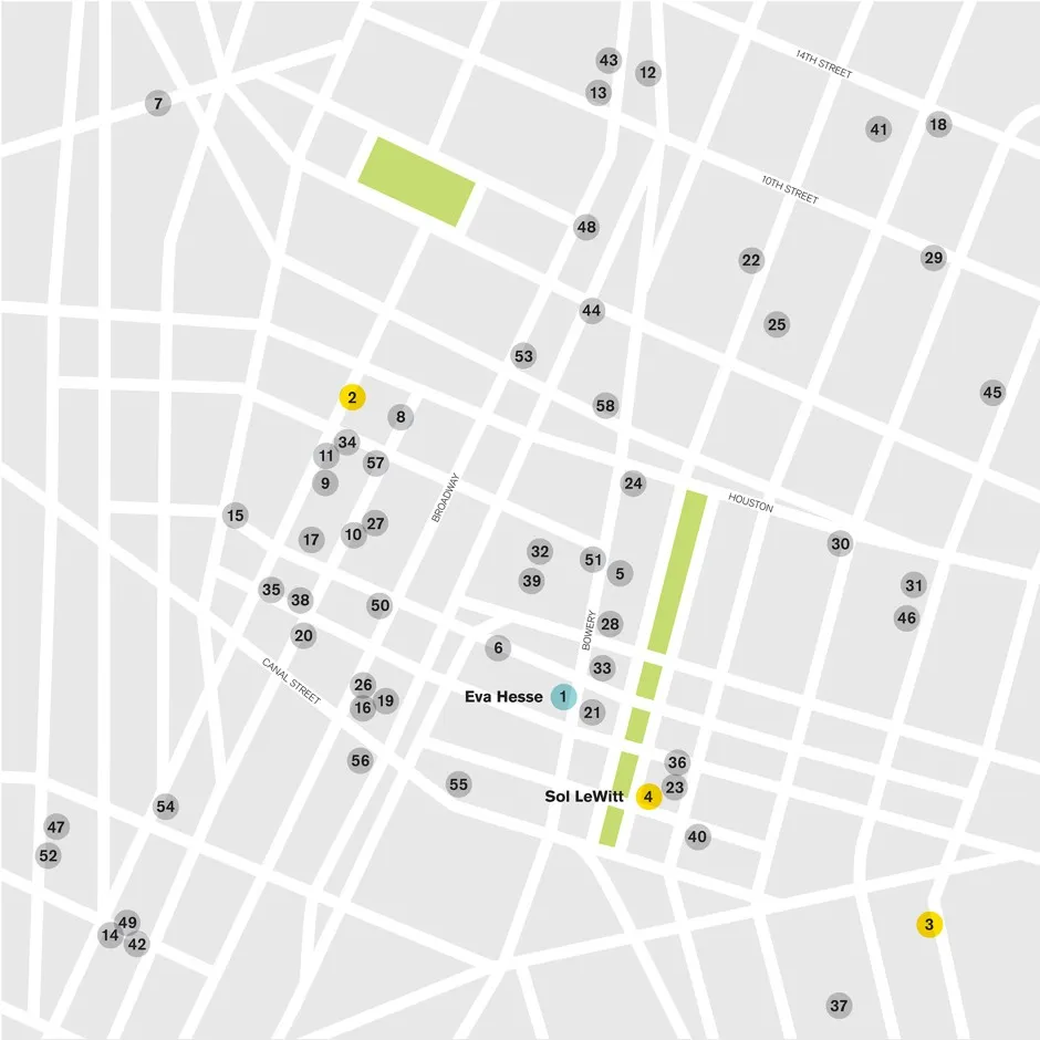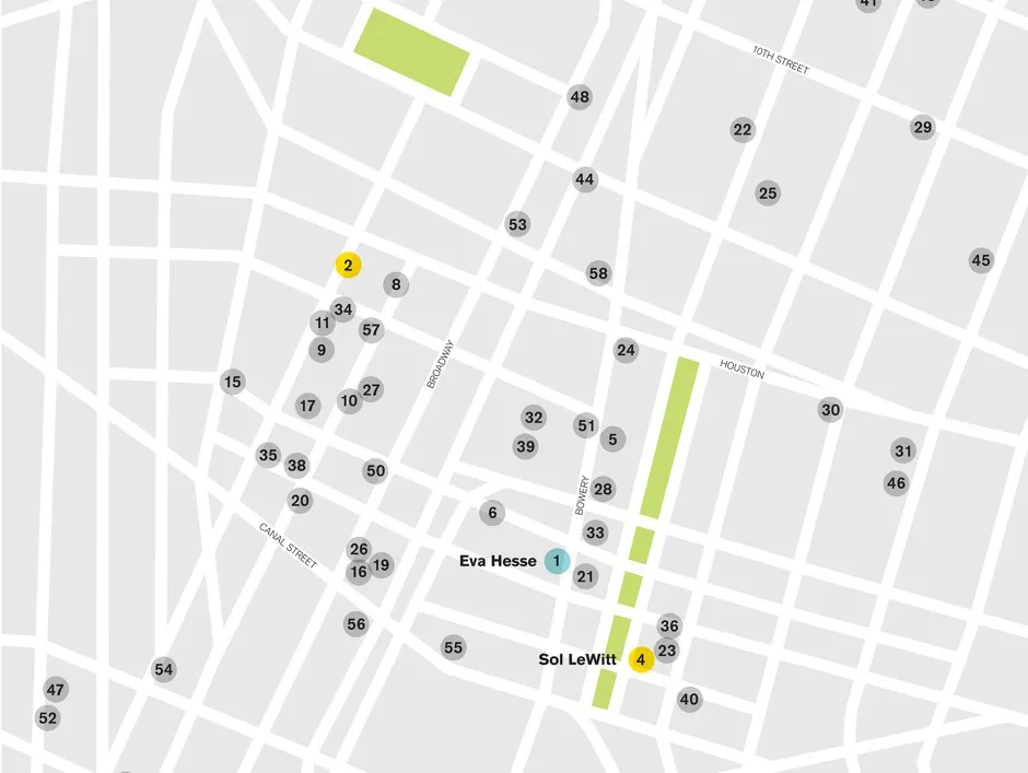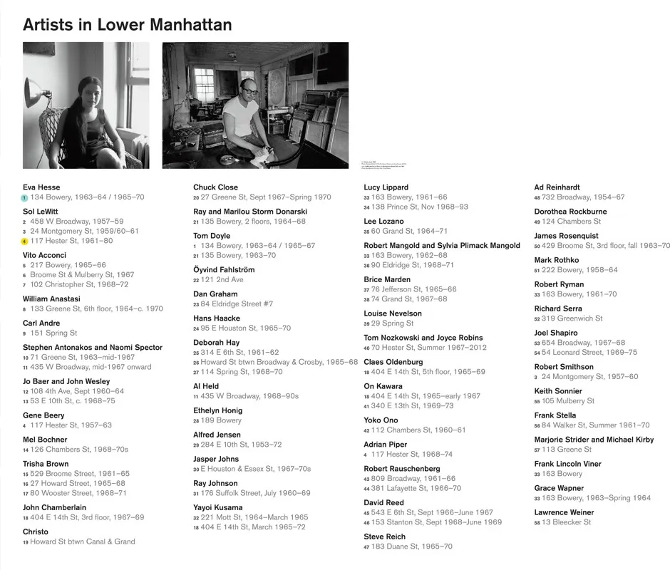 地图的图例由传奇人物组成:雕塑家(丹·格雷厄姆,路易丝·内维尔森);画家(贾斯珀·约翰斯,罗伯特·劳申伯格);观念艺术家(李·洛扎诺,劳伦斯·温纳);理论家(露西·利帕德,阿德里安·派珀);表演艺术家(维托·阿肯奇,特里莎·布朗);以及上述所有人(小野洋子)。地图上的名字足以建立一个(非常封闭、白人、纽约中心主义的)当代艺术博物馆。而这些名字仍然响亮: 草间弥生将在2月于赫希霍恩博物馆和雕塑花园享受她的迷幻装置艺术的重大回顾展; 查克·克洛斯是现在《纽约时报杂志》中的一篇史诗特写的主题。
