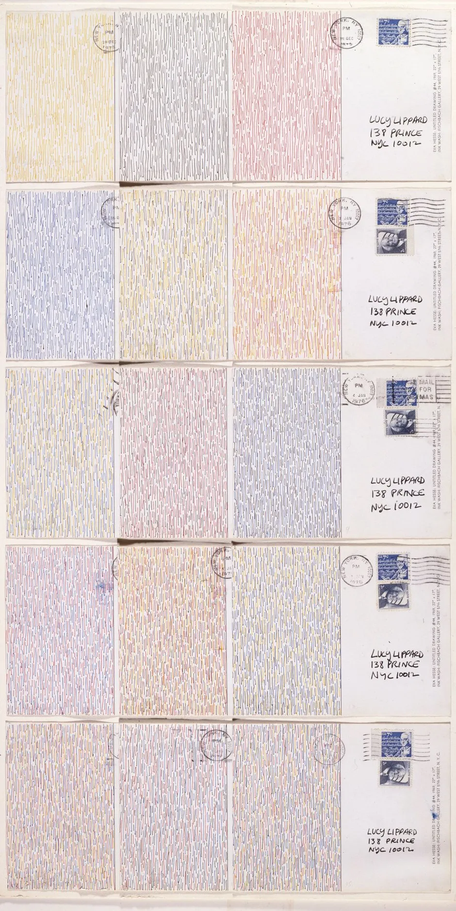 1976年,Sol LeWitt寄给Lucy Lippard的十五张明信片。LeWitt遗产/艺术家权利协会“汇聚线条”之所以如此引人注目,是因为它强调人际关系作为创作的熔炉。LeWitt给Hesse和其他艺术家写了明信片,这些聪明的通信示例正在展出。例如,他寄给评论家和理论家Lippard的明信片,可以作为一门关于极简主义和战后艺术策略的课程资料。但LeWitt和Lippard并不是在分享他们在线获取的想法;他们在创造一些新的东西,特定于一个时间——是的,特定于一个地点。